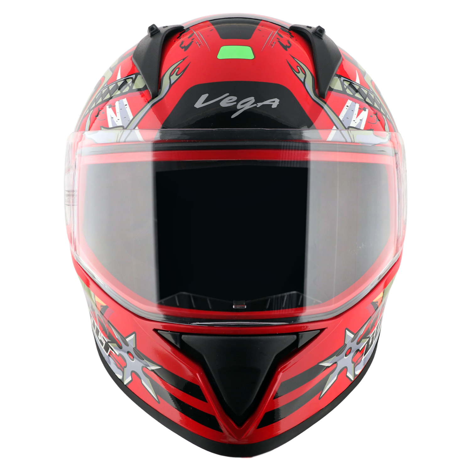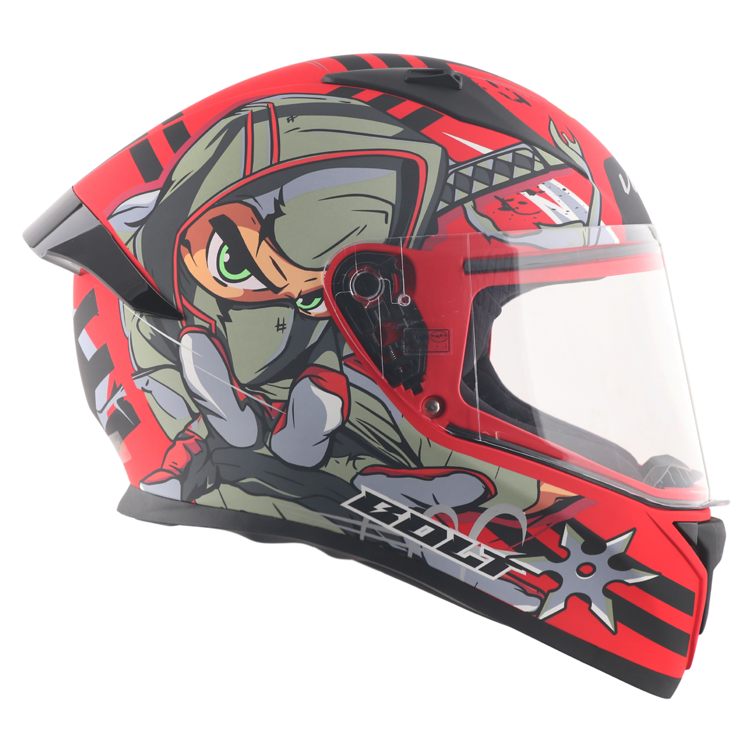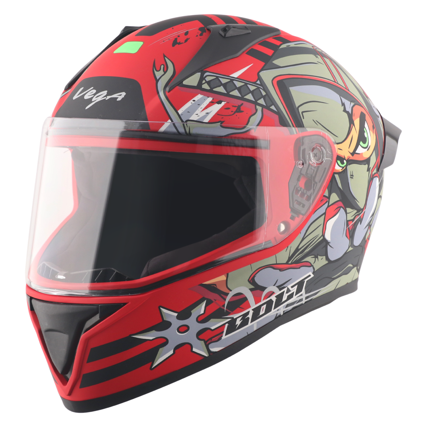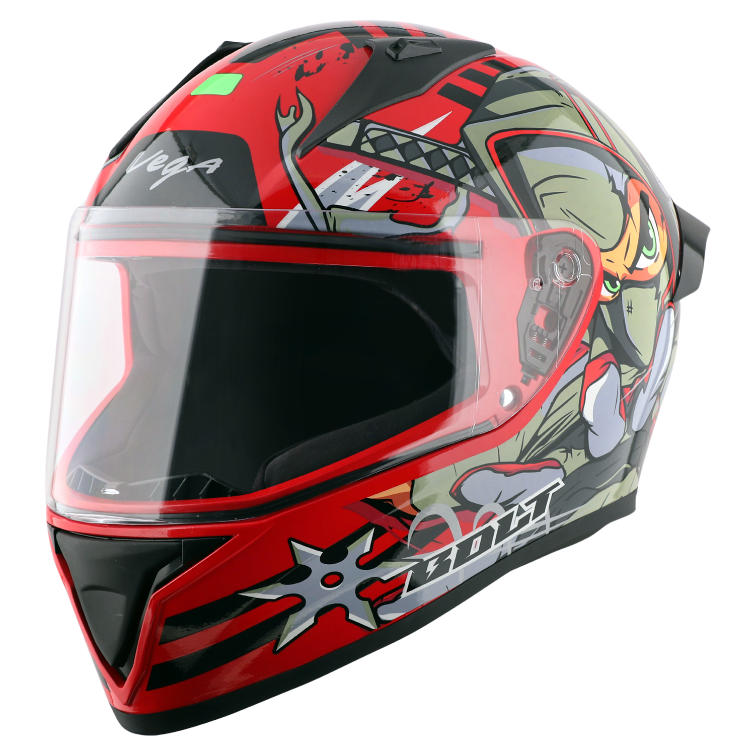 Bolt Ninja Helmet is a stylish and protective full‑face motorcycle helmet from Vega that blends bold street‑inspired graphics with essential safety features. Designed for riders who want both everyday protection and a striking visual identity on the road, this helmet includes a clear visor for unobstructed vision, ISI and DOT certifications for safety compliance, and ventilation and comfort features to support longer rides.