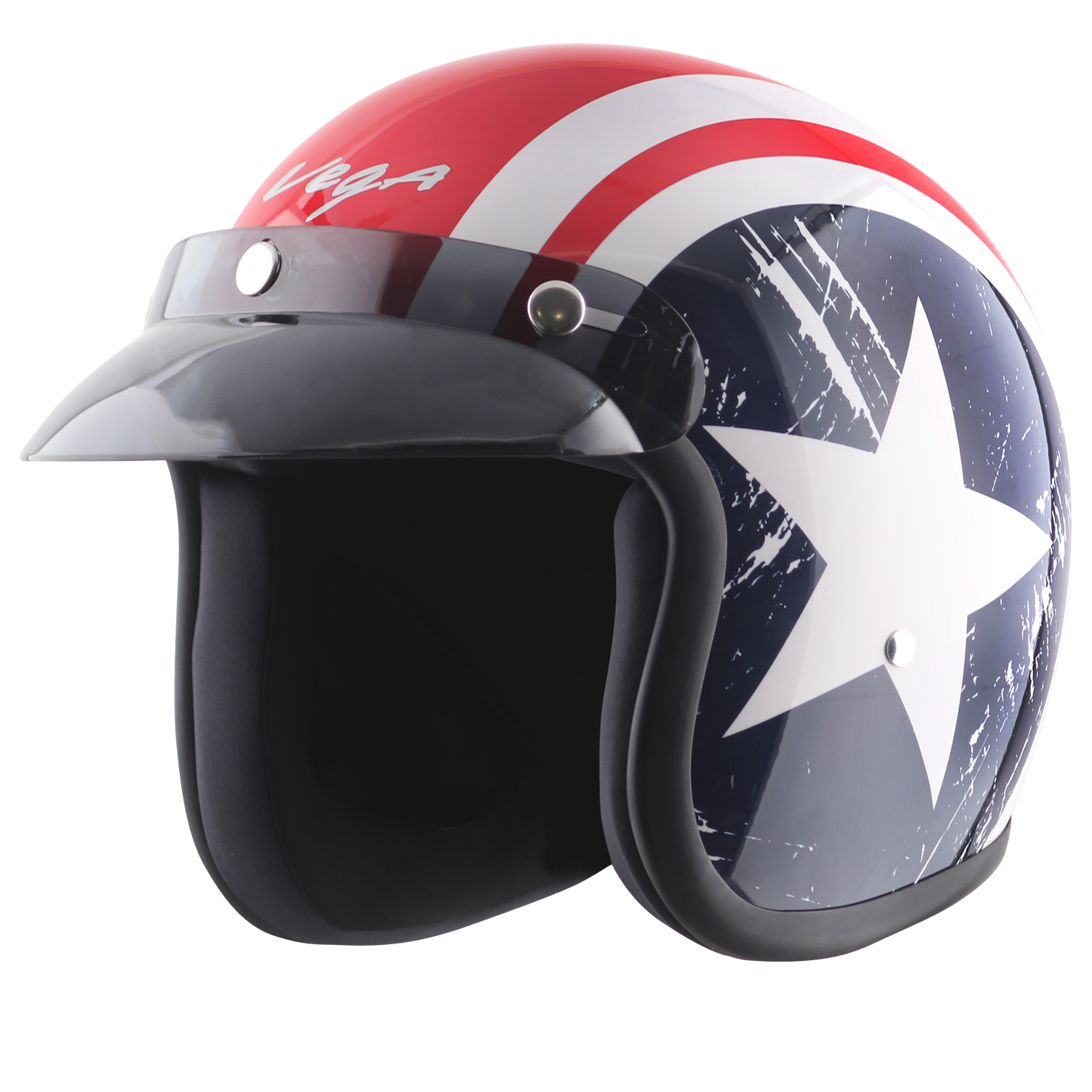 If you are looking for vibrant colors with a sporty look then the Captain graphic on the VEGA JET helmet is the apt thing you can ever have. The star design on the Captain Jet helmet has a metallic touch that shines bright while you’re riding in this summer breeze. This helmet comes with a peak that allows you to wear the glares of your choice and flaunt your styling sense.